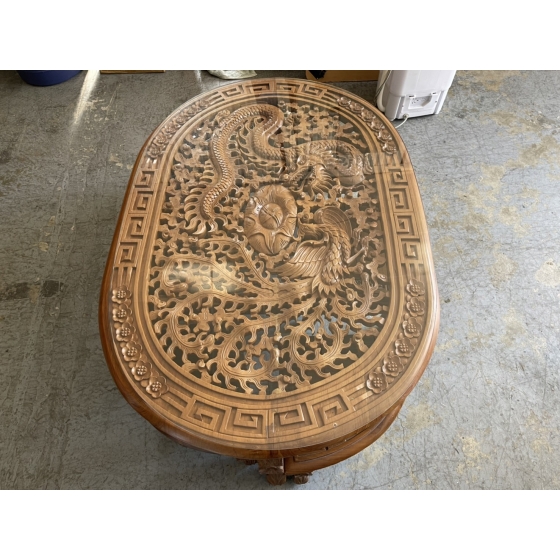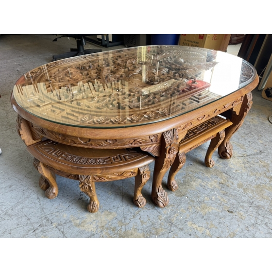 大三元二手家具*柚木實木龍鳳木雕橢圓茶几桌含四椅*實木家具-木雕茶几桌椅-柚木泡茶桌椅-一桌六椅-台中二手家具-城市二手